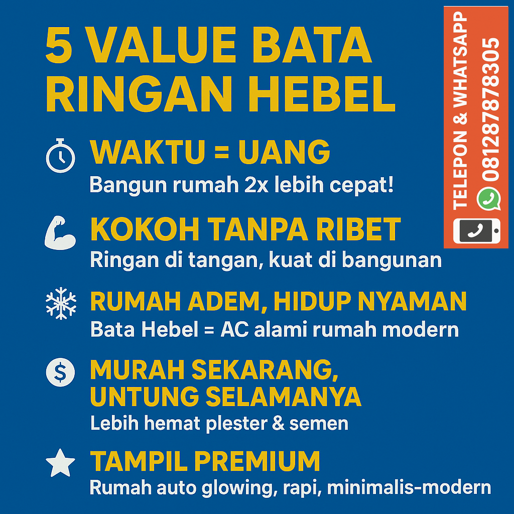 Bata Ringan (Hebel) adalah solusi material bangunan modern yang dirancang untuk menghadirkan konstruksi yang lebih kuat, ringan, dan efisien dibandingkan bata merah tradisional. Terbuat dari teknologi Autoclaved Aerated Concrete (AAC), bata ringan memiliki keunggulan berupa pemasangan cepat, hasil dinding yang rapi, tahan api, ramah lingkungan, serta mampu mengurangi biaya pembangunan.